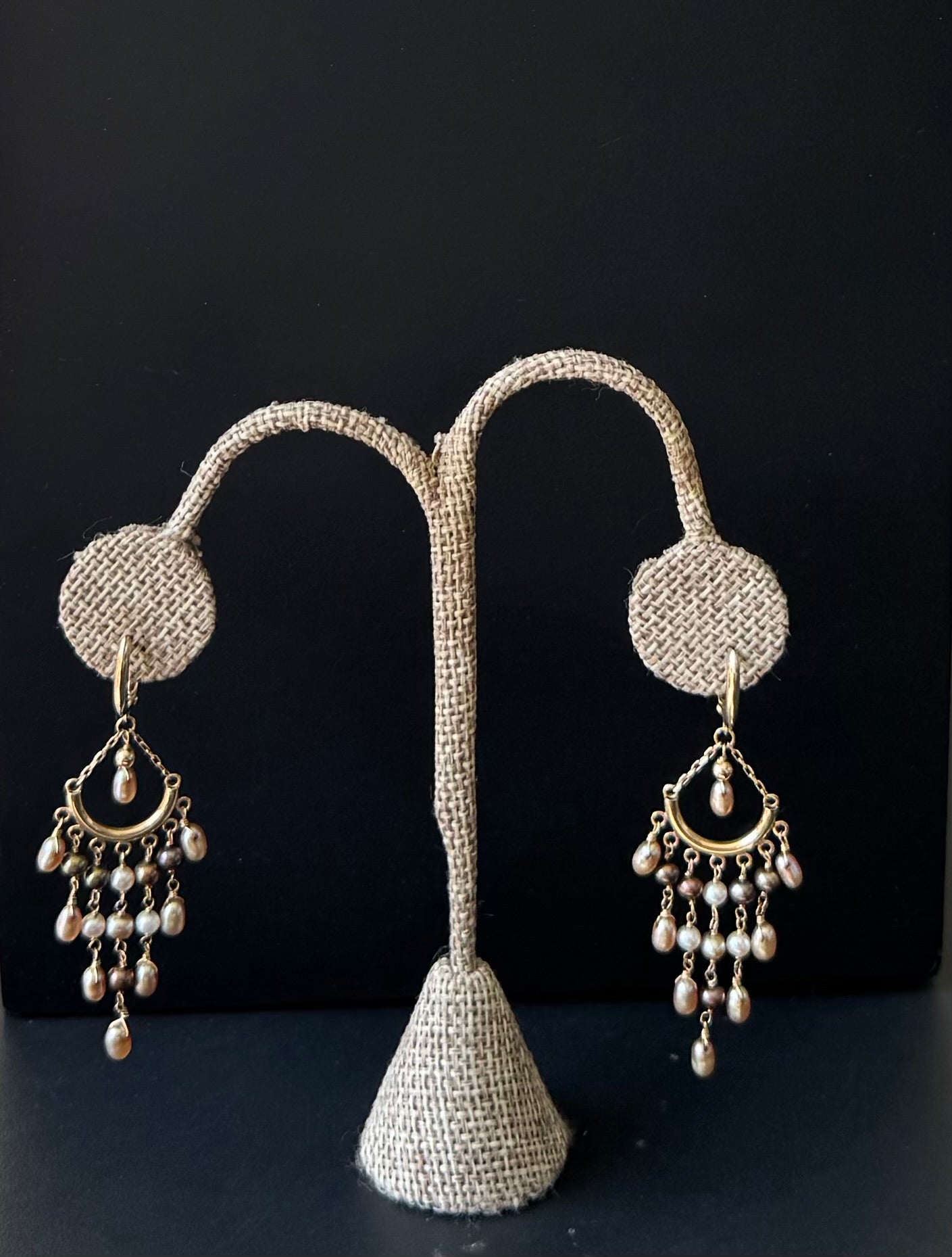 Aros Largos Chandelier en Oro Amarillo 14k con Perlas Champagne