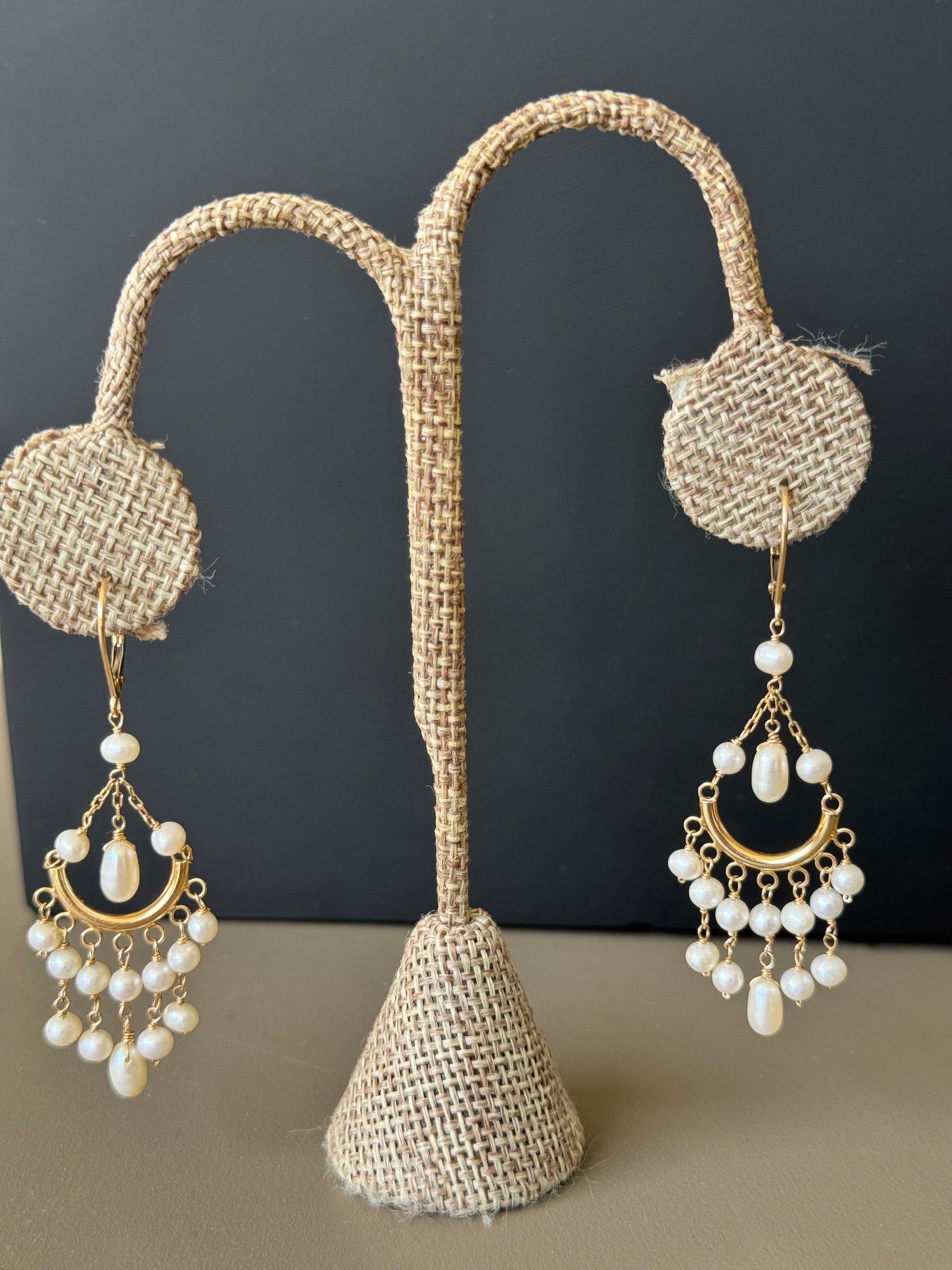 Aros largos chandelier en oro amarillo 14k con perlas blancas
