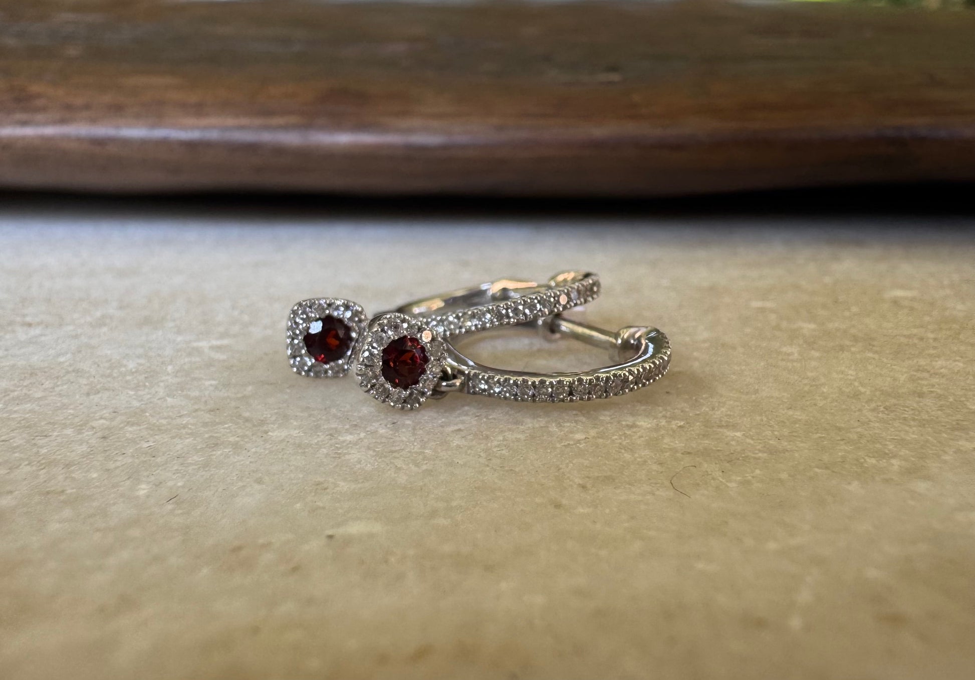 Con una delicadeza en cada detalle, estos aros en oro blanco 10k destacan por su belleza y elegancia. La argolla tiene brillantes engastados y el cuadrado central tiene engastado un granate facetado que aportan un brillo sutil.