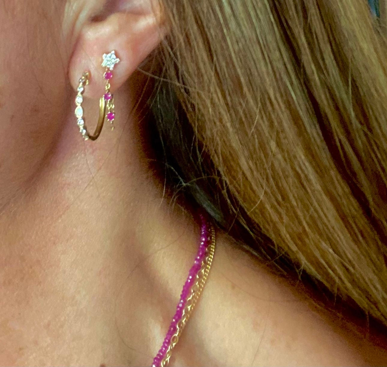 Estos aros de oro amarillo14k combinan la elegancia con la singularidad, presentando una estrella de brillantes y una cadena con rubíes que resalta su delicado diseño. Con un peso total de 2,28gr y un largo de 2,2cm, son la pieza perfecta para cualquier ocasión. La colección curada garantiza una selección cuidadosamente trabajada para destacar por su belleza.