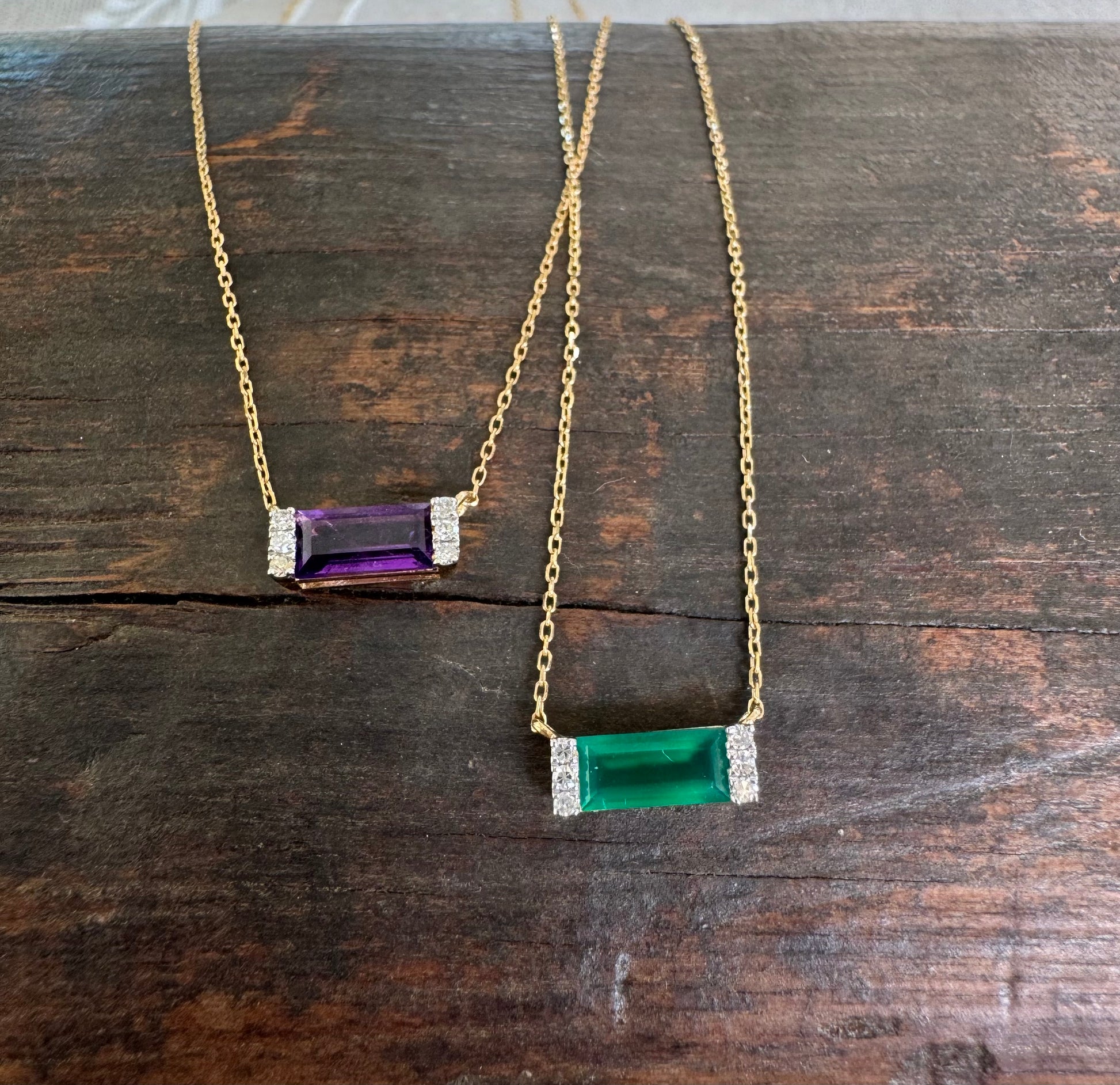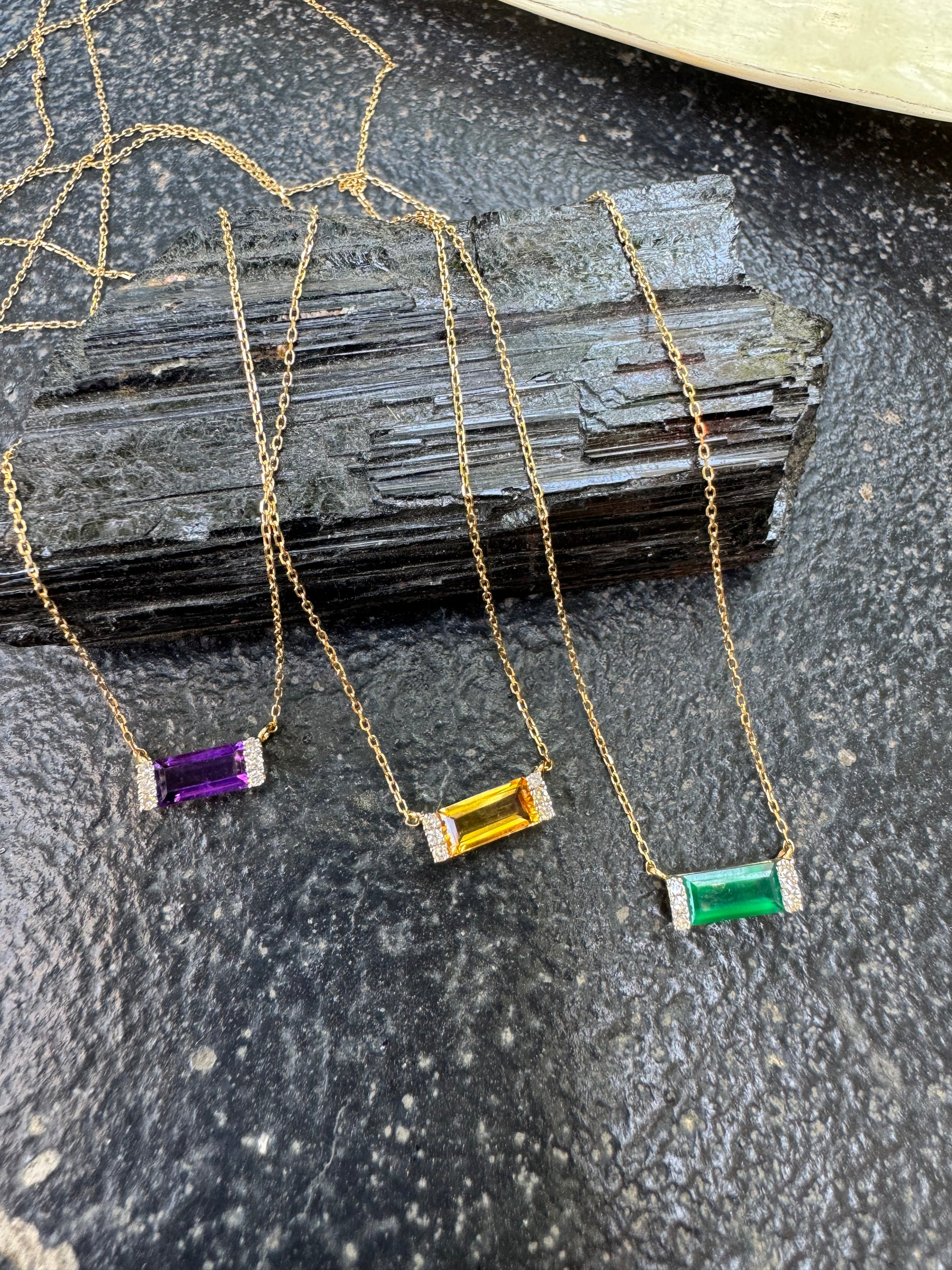 Este collar de oro amarillo 14k con amatista rectangular y brillantes detalles de diamantes es una pieza única y llamativa. La amatista, cuidadosamente seleccionada, aporta una sensación de calma y equilibrio, mientras que su diseño versátil lo hace perfecto para cualquier ocasión.